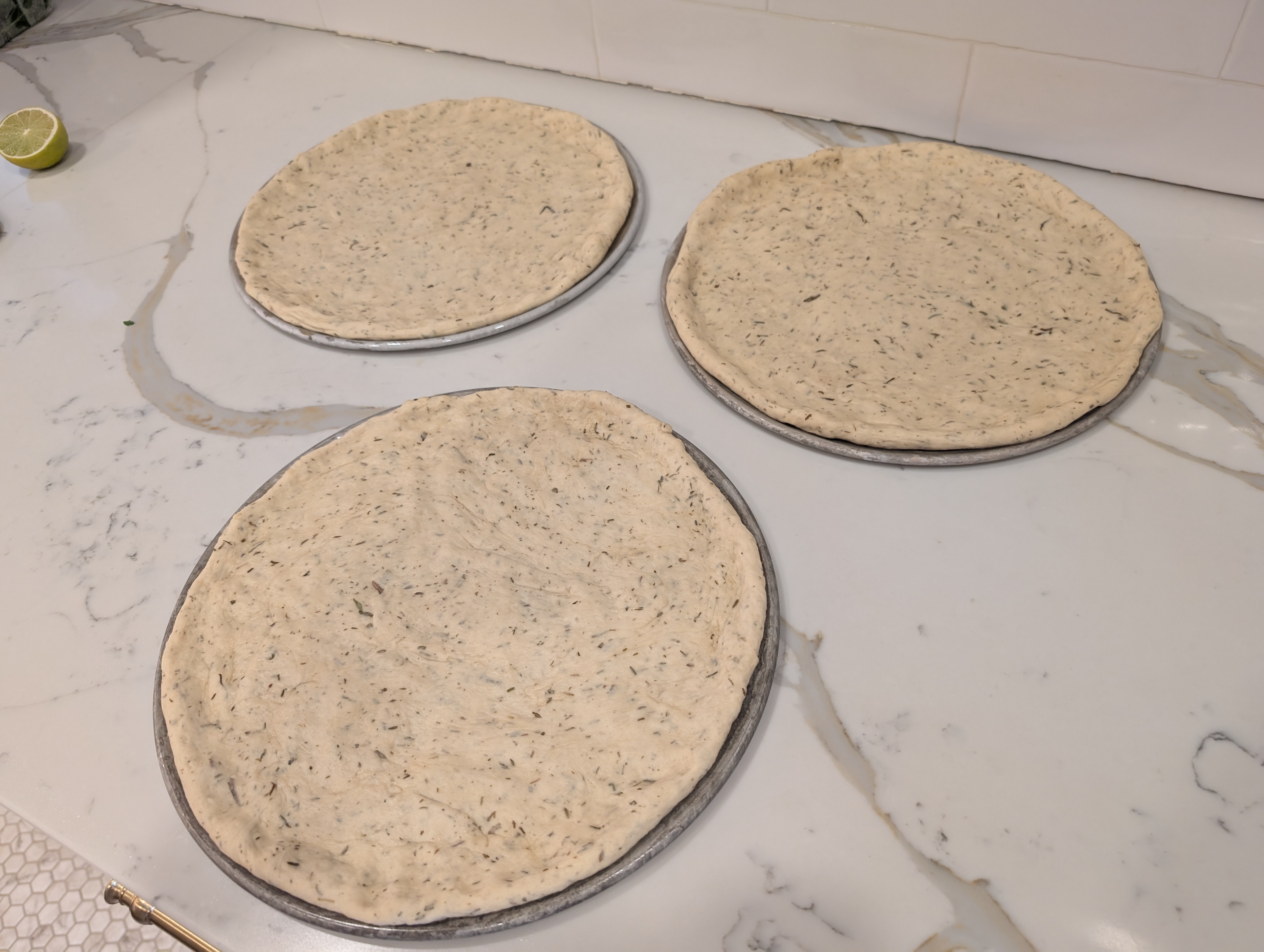 Pizza dough is better stretched than rolled. When your dough is ready, split into 3 balls for round pizzas and shape each piece into a thick disc. Using the pads of your fingers, starting in the middle (like where a bagel’s hole would be), turn the dough as you lightly press the dough thinner and toward the outside of the disc. As it gets bigger, let gravity do the work: rotate it while it hangs to get a thin, even round. Place it on the prepared pans when its about 12″ around, then (still using the pads of your fingers to avoid punching holes through the dough), work the edges out to meet the edge of the pan. You don’t need to roll the edges up to get a nice crust, just whatever little bit of extra is there will be perfect.